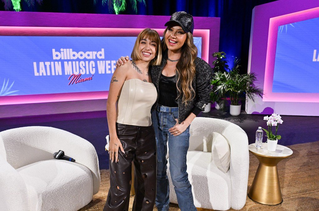 Maria Becerra and Thalía during Billboard Latin Music Week Day 3 Panels at the Fillmore Miami Beach on Oct. 16, 2024 in Miami Beach, Florida.