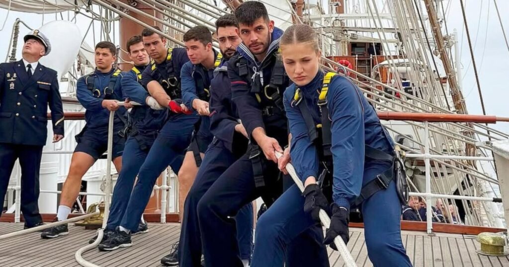 También se puede ver a la princesa haciendo ejercicios más físicos, tirando de cuerdas para que las velas tomen la posición correcta. Como una más entre sus compañeros, la joven de Asturias, con guantes y bien protegida, cumple con estas funciones que requieren de un gran entrenamiento de fuerza, de ahí que durante la travesía los alumnos también estén recibiendo clases de ejercicio, para estar en forma.