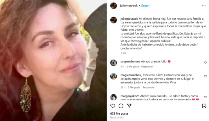 En dicha publicación, el artista había escrito: «Mi silencio hasta hoy, fue por respeto a tu familia a tus seres queridos y a la justicia para todo lo que necesiten de mí. Hoy te recuerdo y quiero expresar a todos la maravillosa mujer que fuiste, eres y serás tu amistad fue algo que me llenó de gratificación. Estarás en mi corazón por siempre, y honraré tu vida, vida que nada le importó a los que construyen la ‘opinión pública’ Ante la dicha de haberte conocido Andrea… solo debo decir: ‘gracias a la vida'».