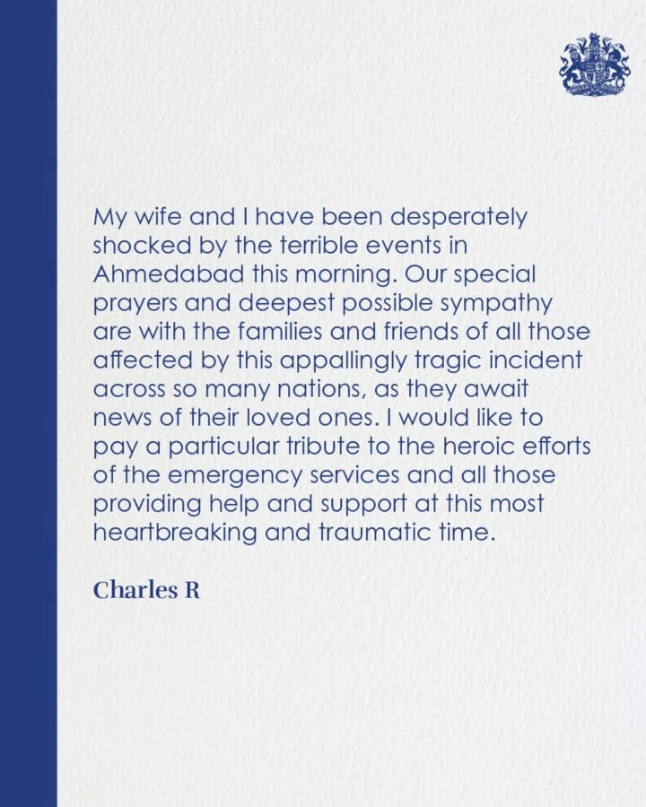 En el emotivo texto que fue compartido en las redes sociales de la corona inglesa, el Rey manifestó: «Mi esposa y yo estamos profundamente conmovidos por los terribles sucesos ocurridos esta mañana en Ahmedabad».