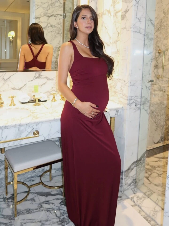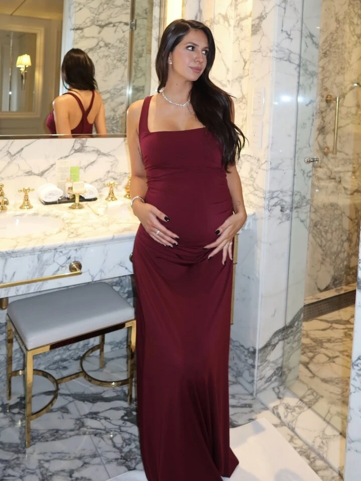 Las imágenes, tomadas en lo que parece ser el baño de un hotel de lujo, muestran a la futura mamá primeriza en un entorno cuidado hasta el último detalle, con mármoles veteados, grifería dorada y luces cálidas que realzan cada uno de los detalles de su look.