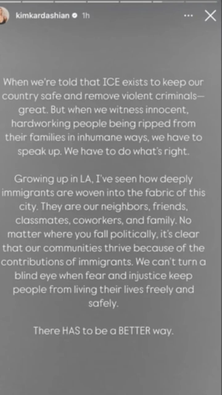 Mientras que artistas, activistas y comunidades migrantes convocaron a marchas, petitorios y apoyo legal subrayando que no debe permitirse que el gobierno criminalice al inmigrante como amenaza colectiva, Kim Kardashian no se quedó callada y publicó un fuerte comunicado.